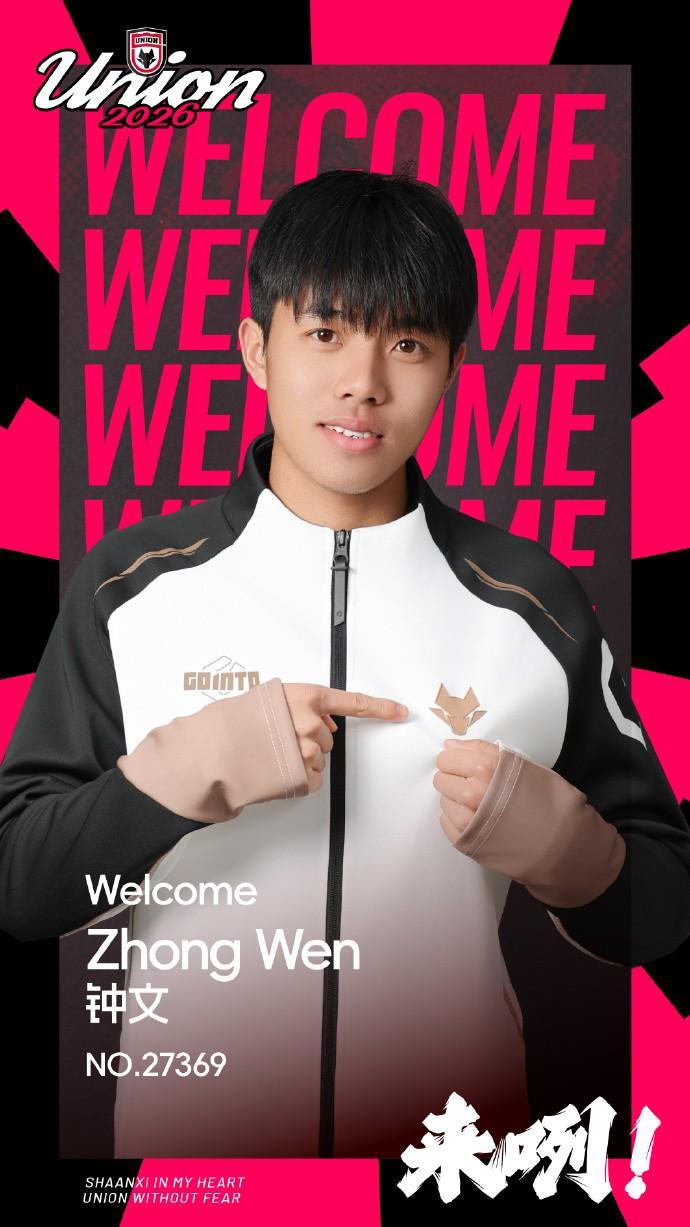 根据俱乐部长期发展规划,经与球员本人友好协商并达成一致,同时经俱乐部技术总监埃德温・彼得森先生完成技术评估与确认:球员钟文(会员号:27369),正式加盟陕西联合足球俱乐部!